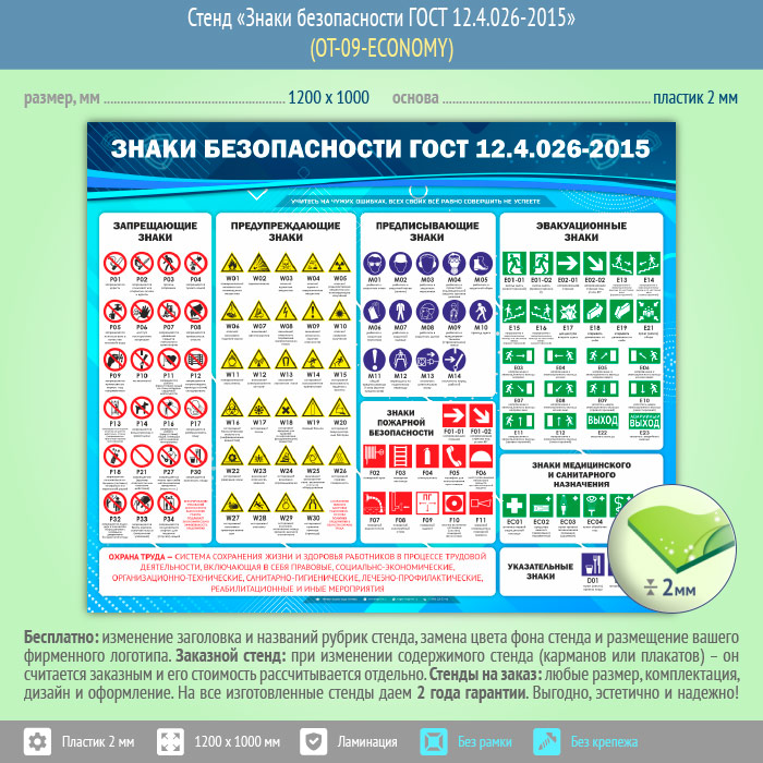Стенд «Знаки безопасности ГОСТ 12.4.026-2015» (OT-09-ECONOMY) в Обнинске купить