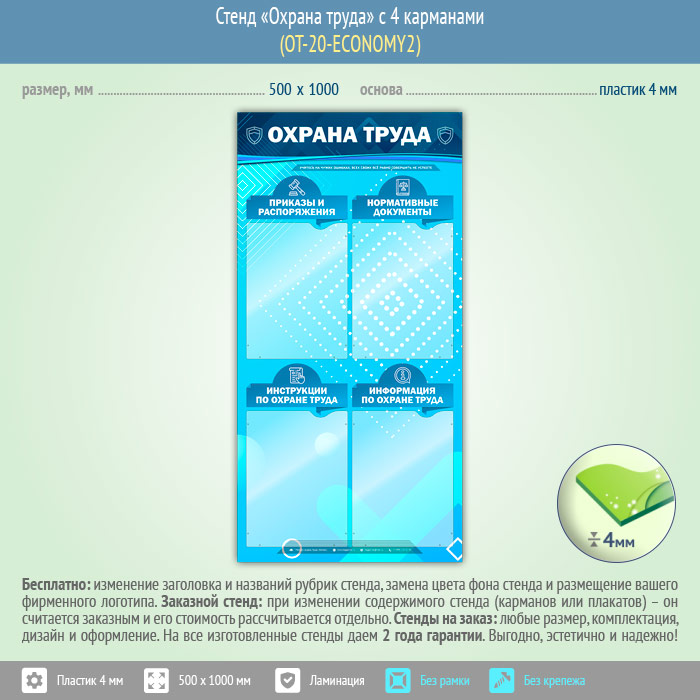 Стенд «Охрана труда» с 4 карманами (OT-20-ECONOMY2) в Обнинске купить