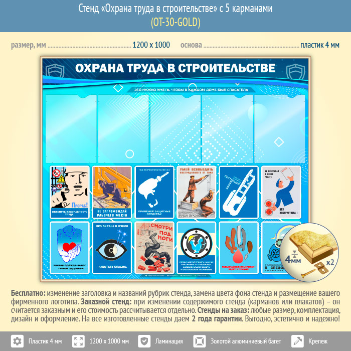 Стенд «Охрана труда в строительстве» с 5 карманами (OT-30-GOLD) в Обнинске купить