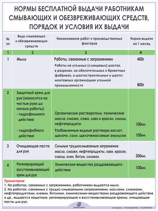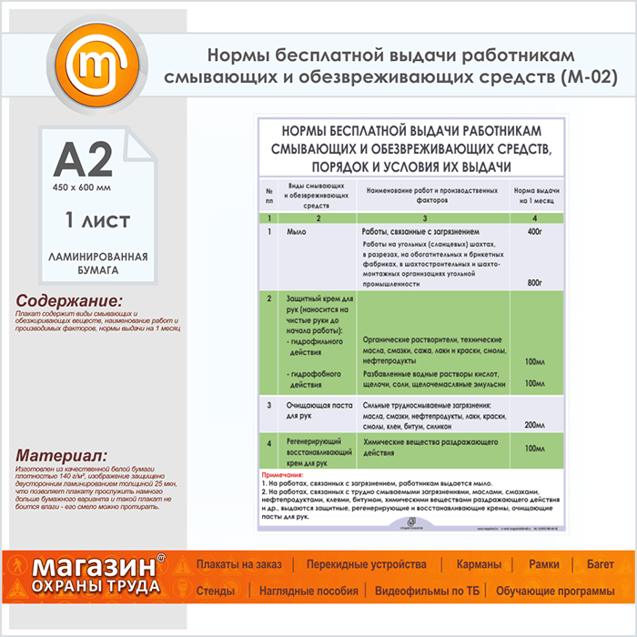 Плакат «Нормы бесплатной выдачи работникам смывающих и обезвреживающих средств» (М-02, ламинированная бумага, А2, 1 лист) в Обнинске купить