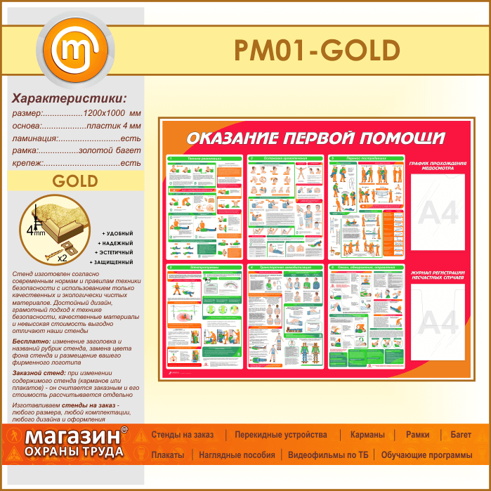 Стенд «Оказание первой помощи» с плоским и объемным карманами (PM-01-GOLD) в Обнинске купить