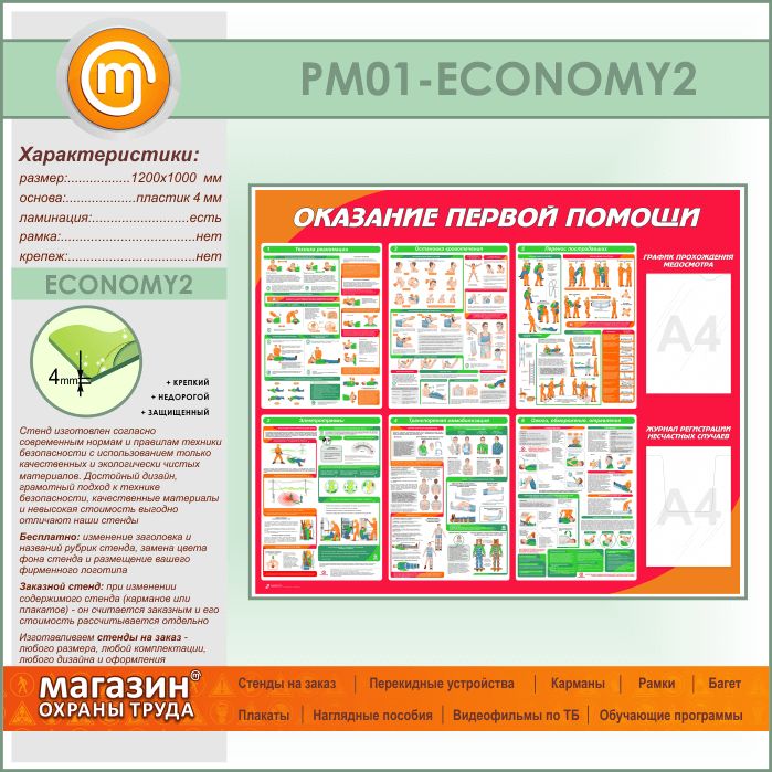 Стенд «Оказание первой помощи» с плоским и объемным карманами (PM-01-ECONOMY2) в Обнинске купить