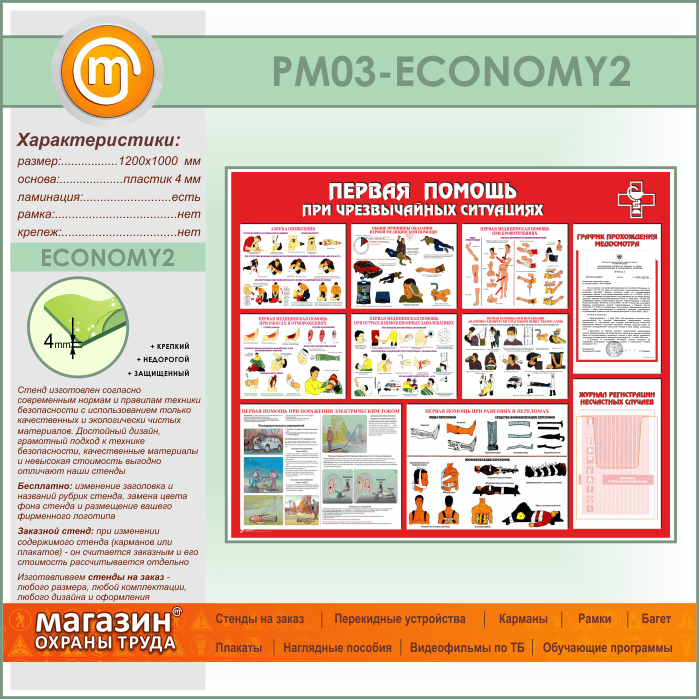 Стенд «Первая помощь при чрезвычайных ситуациях» с плоским и объемным карманами (PM-03-ECONOMY2) в Обнинске купить