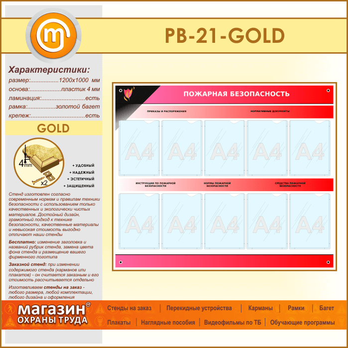 Стенд «Пожарная безопасность» с 10 карманами (PB-21-GOLD) в Обнинске купить
