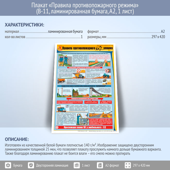 Плакат «Правила противопожарного режима» (В-11, ламинированная бумага, А2, 1 лист) в Обнинске купить