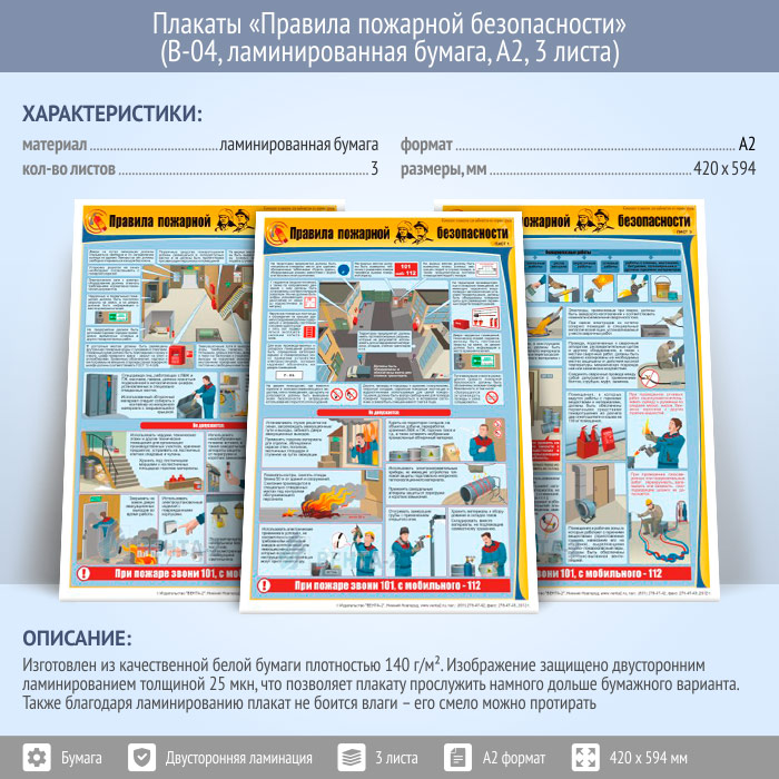 Плакаты «Правила пожарной безопасности» (В-04, ламинированная бумага, А2, 3 листа) в Обнинске купить