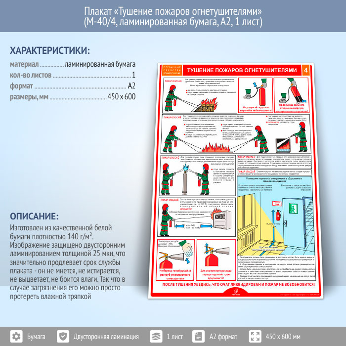 Плакат «Тушение пожаров огнетушителями» (М-40/4, ламинированная бумага, А2, 1 лист) в Обнинске купить