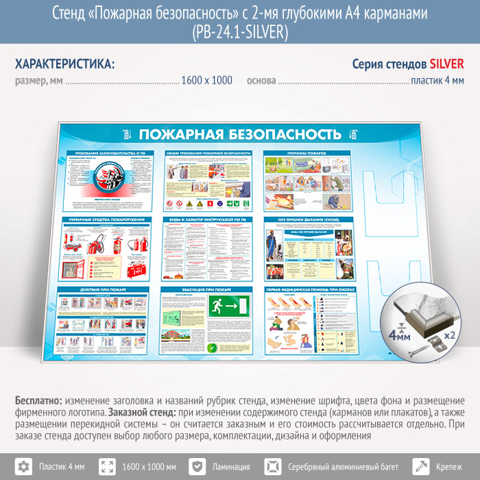 Стенд «Пожарная безопасность» с 2-мя глубокими А4 карманами (PB-24.1-SILVER) в Обнинске купить