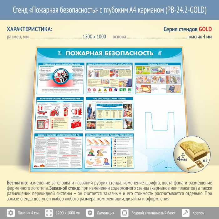 Стенд «Пожарная безопасность» с глубоким А4 карманом (PB-24.2-GOLD) в Обнинске купить
