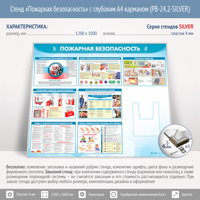 Стенд «Пожарная безопасность» с глубоким А4 карманом (PB-24.2-SILVER) в Обнинске купить