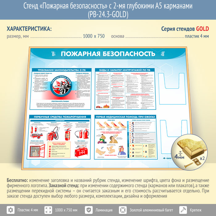 Стенд «Пожарная безопасность» с 2-мя глубокими А5 карманами (PB-24.3-GOLD) в Обнинске купить