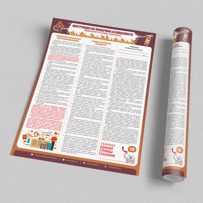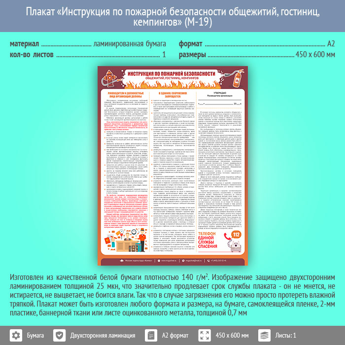 Плакат «Инструкция по пожарной безопасности общежитий, гостиниц, кемпингов» (М-19, ламинированная бумага, А2, 1 лист) в Обнинске купить