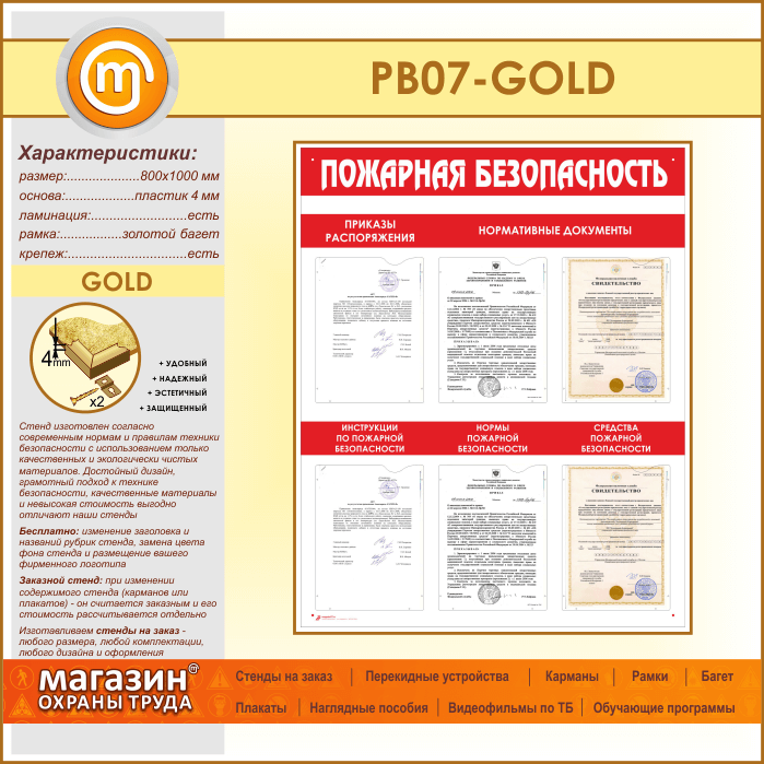 Стенд «Пожарная безопасность» с 6 карманами (PB-07-GOLD) в Обнинске купить