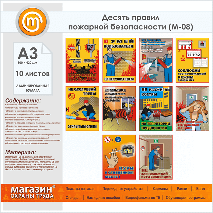 Плакаты «Десять правил пожарной безопасности» (М-08, ламинированная бумага, А3, 10 листов) в Обнинске купить