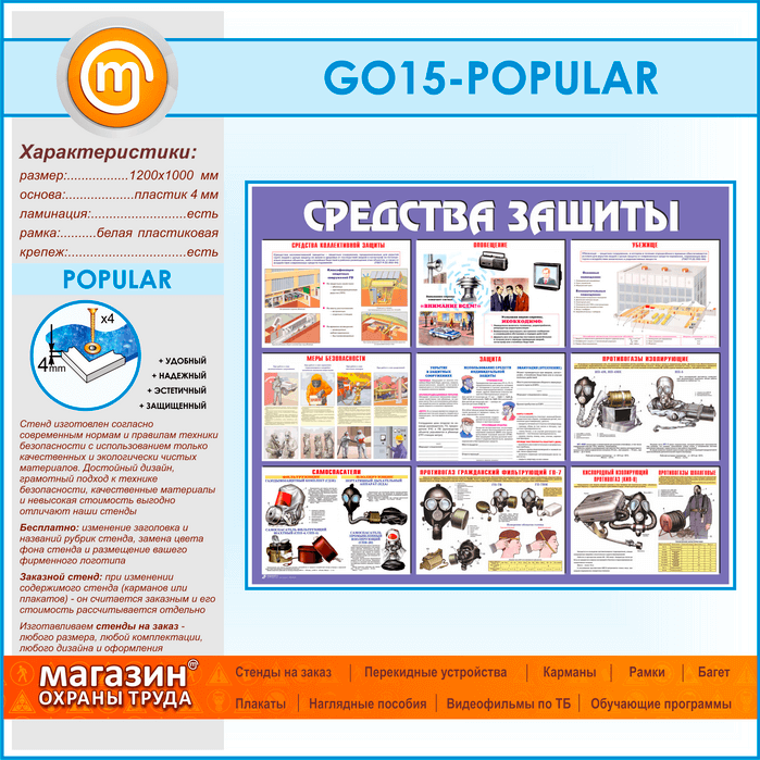 Стенд «Средства защиты» – расскажет о способах и средствах защиты в чрезвычайных ситуациях: это оповещение и убежища, средства коллективной защиты и меры безопасности. На стенде представлены и средства индивидуальной защиты: противогазы изолирующие, самоспасатели, противогазы фильтрующие, шланговые и кислородные…
