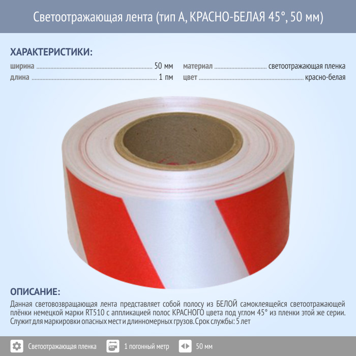 Светоотражающая сигнальная лента (тип А, КРАСНО-БЕЛАЯ 45°, 50 мм х 1 п.м.) в Обнинске купить