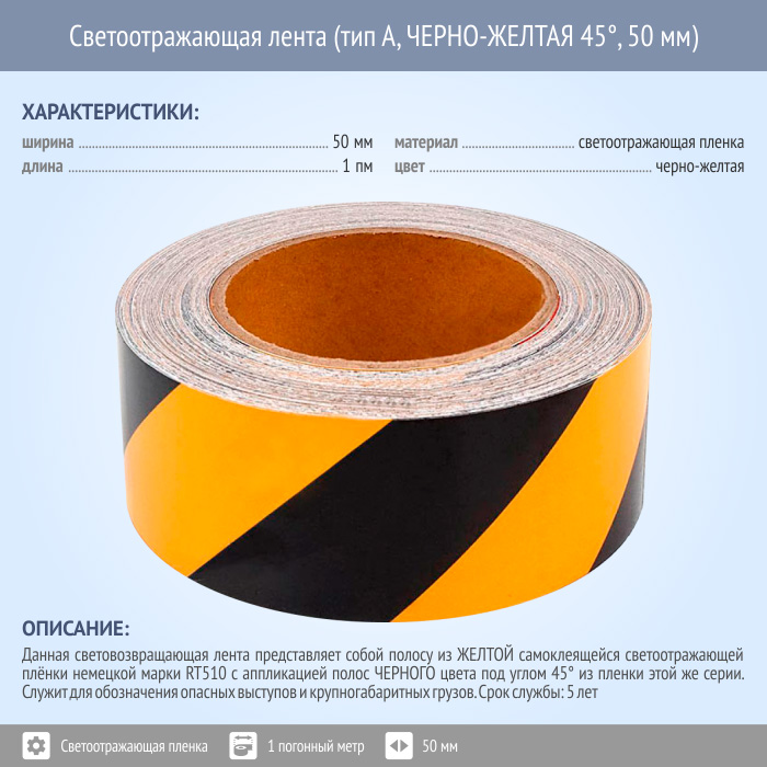 Светоотражающая сигнальная лента (тип А, ЧЕРНО-ЖЕЛТАЯ 45°, 50 мм х 1 п.м.) в Обнинске купить