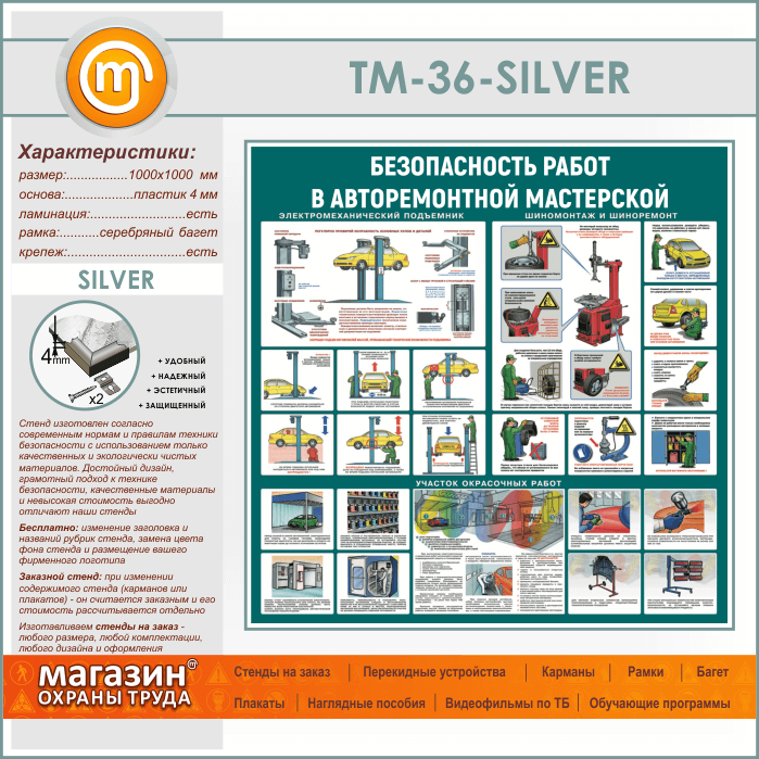 Стенд «Безопасность работ в авторемонтной мастерской» (TM-36-SILVER) в Обнинске купить