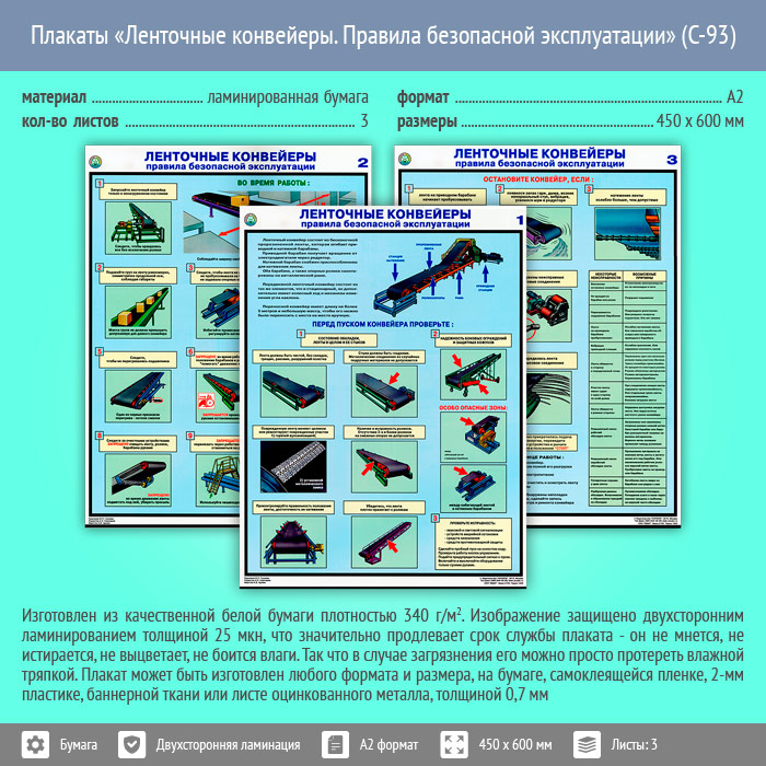 Плакаты «Ленточные конвейеры. Правила безопасной эксплуатации» (С-93, ламинированная бумага, А2, 3 листа) в Обнинске купить