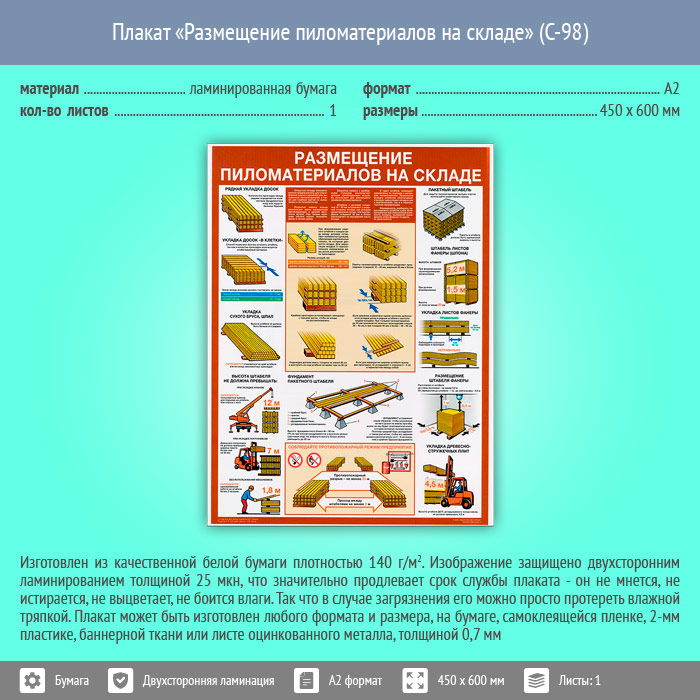 Плакат «Размещение пиломатериалов на складе» (С-98, ламинированная бумага, А2, 1 лист) в Обнинске купить