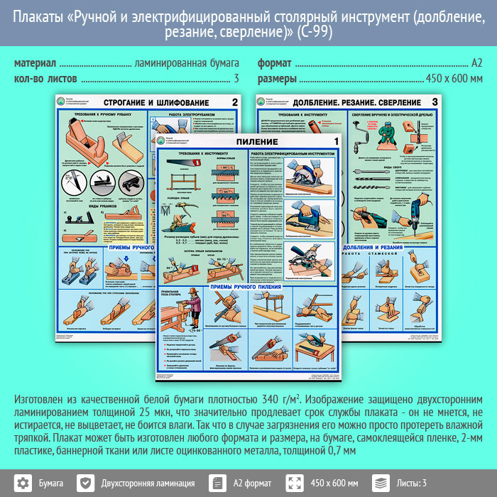 Плакаты «Ручной и электрифицированный столярный инструмент» (С-99, ламинированная бумага, А2, 3 листа) в Обнинске купить