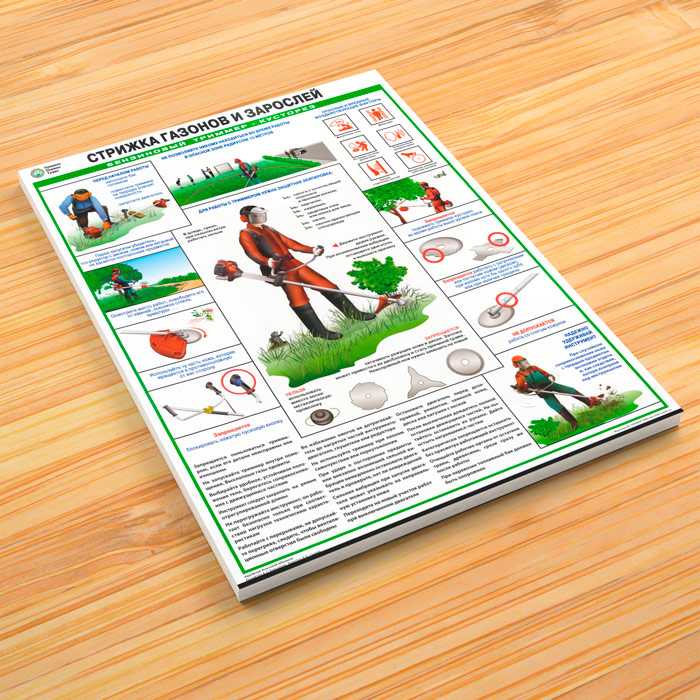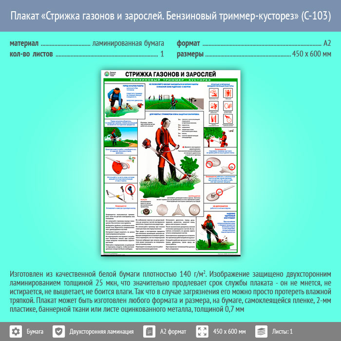 Плакат «Стрижка газонов и зарослей. Бензиновый триммер-кусторез» (С-103, ламинированная бумага, А2, 1 лист) в Обнинске купить