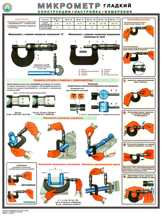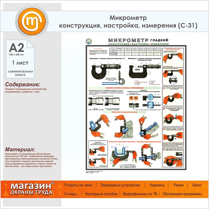 Плакат «Микрометр - конструкция, настройка, измерения» (С-31, ламинированная бумага, А2, 1 лист) в Обнинске купить