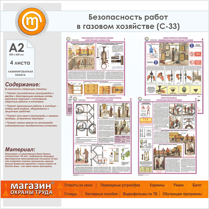 Плакаты «Безопасность работ в газовом хозяйстве» (С-33, ламинированная бумага, А2, 4 листа) в Обнинске купить