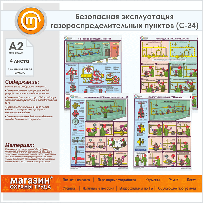 Плакаты «Безопасная эксплуатация газораспределительных пунктов» (С-34, ламинированная бумага, А2, 4 листа) в Обнинске купить