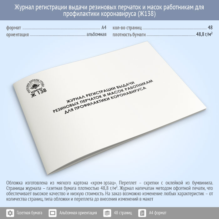 Журнал регистрации выдачи резиновых перчаток и масок работникам для профилактики коронавируса (48 стр., Ж138) в Обнинске купить