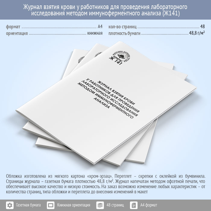 Журнал взятия крови у работников для проведения лабораторного исследования методом иммуноферментного анализа (48 стр., Ж141) в Обнинске купить