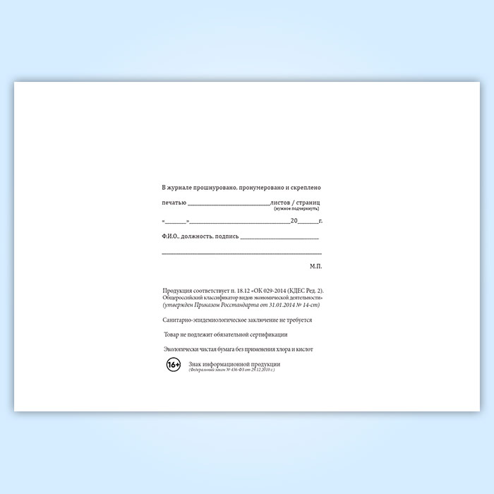 Вы получаете печатную продукцию прошнурованной и c местом для вашей печати в соответствии с действующими нормативными документами: