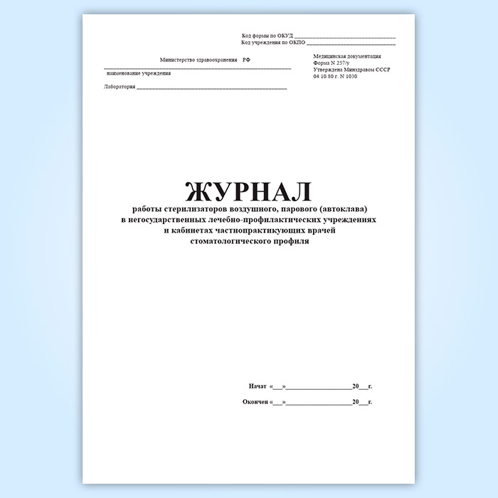 Журнал работы стерилизаторов воздушного, парового (автоклава) в негосударственных лечебно-профилактических учреждениях и кабинетах частнопрактикующих врачей стоматологического профиля (форма 257/у) в Обнинске купить