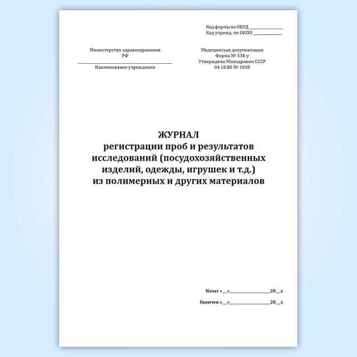 Журнал регистрации проб и результатов исследований (посудохозяйственных изделий, одежды, игрушек и т.д.) из полимерных и других материалов (форма № 338-у) в Обнинске купить