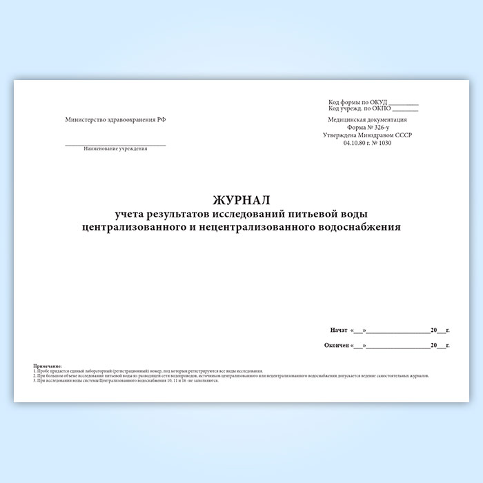 Журнал учета результатов исследований питьевой воды централизованного и нецентрализованного водоснабжения (форма 326-у) в Обнинске купить
