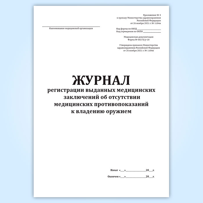 Журнал регистрации выданных медицинских заключений об отсутствии медицинских противопоказаний к владению оружием (форма 002-О/У-10) в Обнинске купить