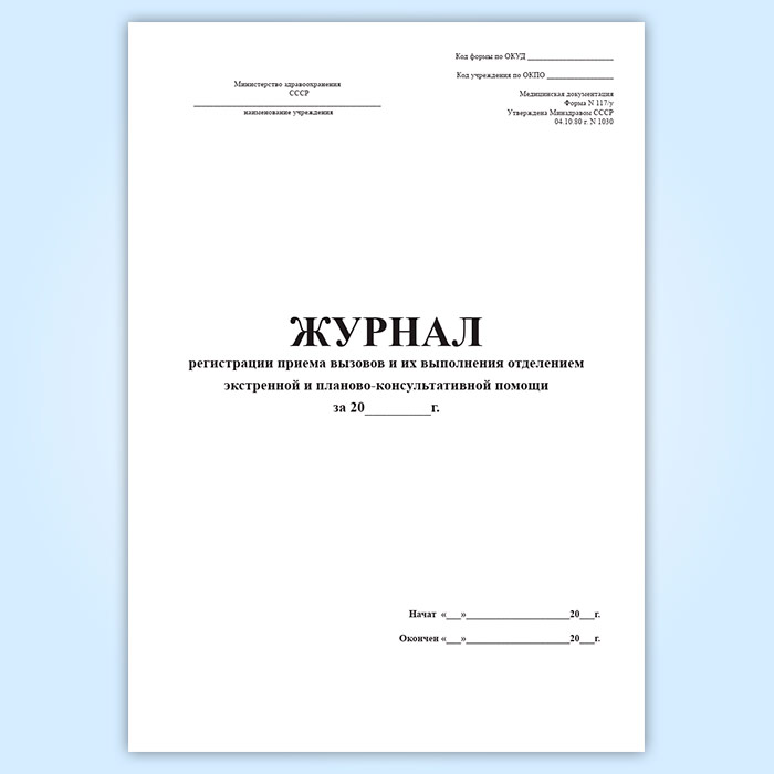 Журнал регистрации приема вызовов и их выполнения отделением экстренной и планово-консультативной помощи (форма 117/у) в Обнинске купить