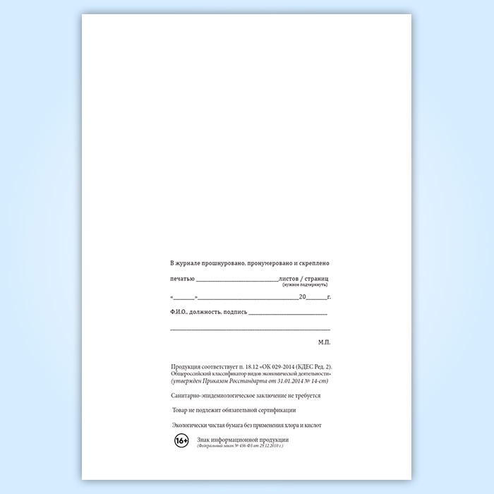 Вы получаете печатную продукцию прошнурованной и c местом для вашей печати в соответствии с действующими нормативными документами: