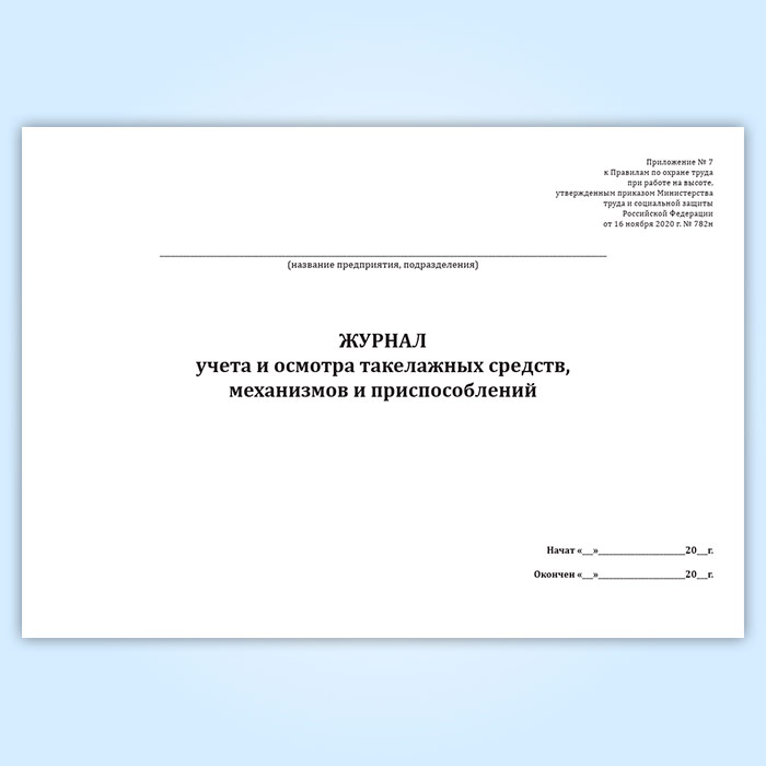 Журнал учета и осмотра такелажных средств, механизмов и приспособлений (Приказ Минтруда России от 16.11.2020 N 782н) в Обнинске купить