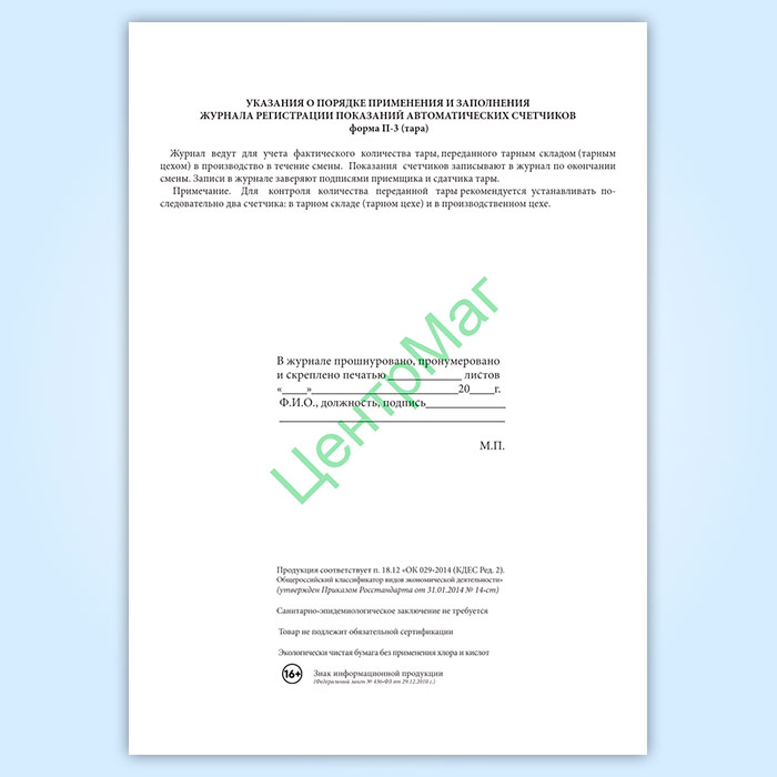 Журнал регистрации показаний автоматических счетчиков (форма № П-3 тара) в Обнинске купить