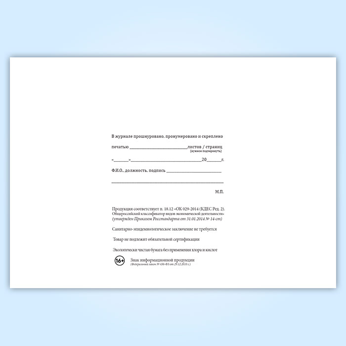 Вы получаете печатную продукцию прошнурованной и c местом для вашей печати в соответствии с действующими нормативными документами: