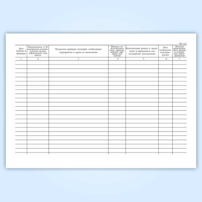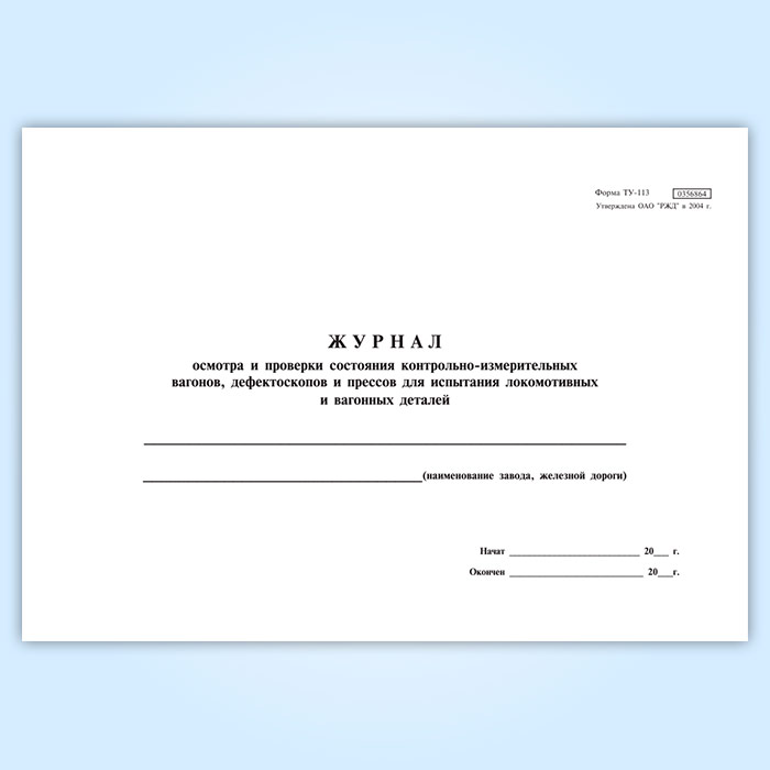 Журнал осмотра и проверки состояния контрольно-измерительных вагонов, дефектоскопов и прессов для испытания локомотивных и вагонных деталей (форма ТУ-113) в Обнинске купить