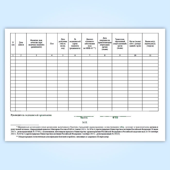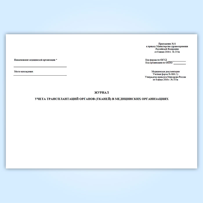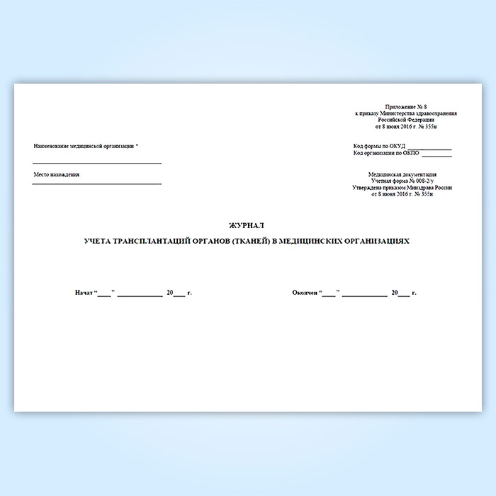 Журнал учета трансплантаций органов (тканей) в медицинских организациях (форма № 008-2/у) в Обнинске купить