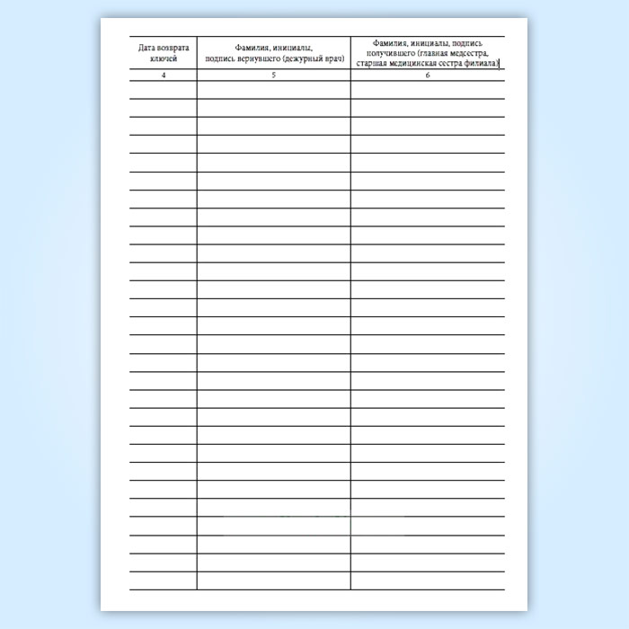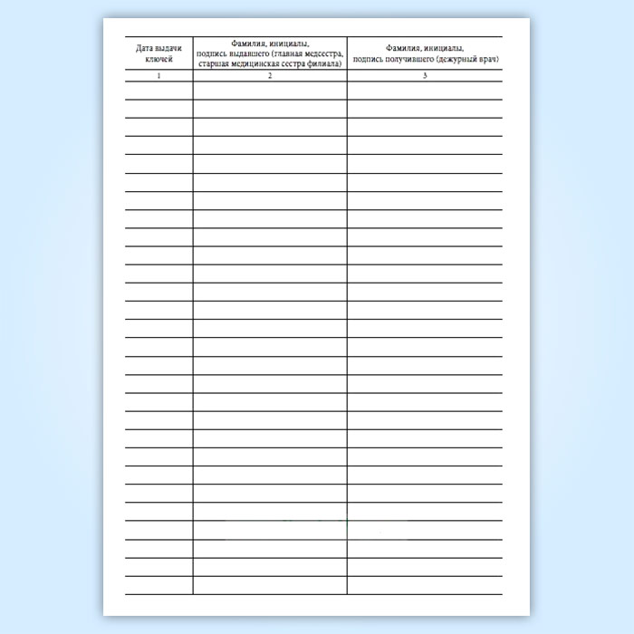 Журнал передачи ключей главной медсестры (старшей медицинской сестры филиала) дежурным врачам от помещения и сейфа, где проводятся операции, связанные с оборотом наркотических средств и психотропных веществ, в выходные и праздничные дни в амбулаторном отделении медицинской организации в Обнинске купить