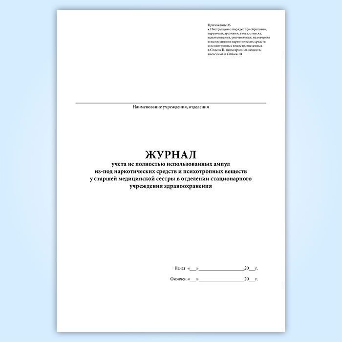 Журнал учета не полностью использованных ампул из-под наркотических средств и психотропных веществ у старшей медицинской сестры в отделении стационарного учреждения здравоохранения в Обнинске купить