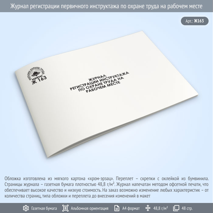 Журнал регистрации первичного инструктажа по охране труда на рабочем месте (Ж163, 48 стр.) в Обнинске купить