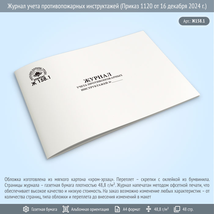 Журнал учета противопожарных инструктажей (Приказ 1120 от 16 декабря 2024 г.) (48 стр., Ж158.1) в Обнинске купить