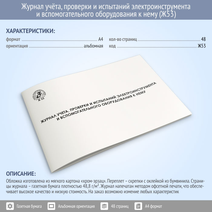 Журнал учета, проверки и испытаний электроинструмента и вспомогательного оборудования к нему (48 стр., Ж53) в Обнинске купить