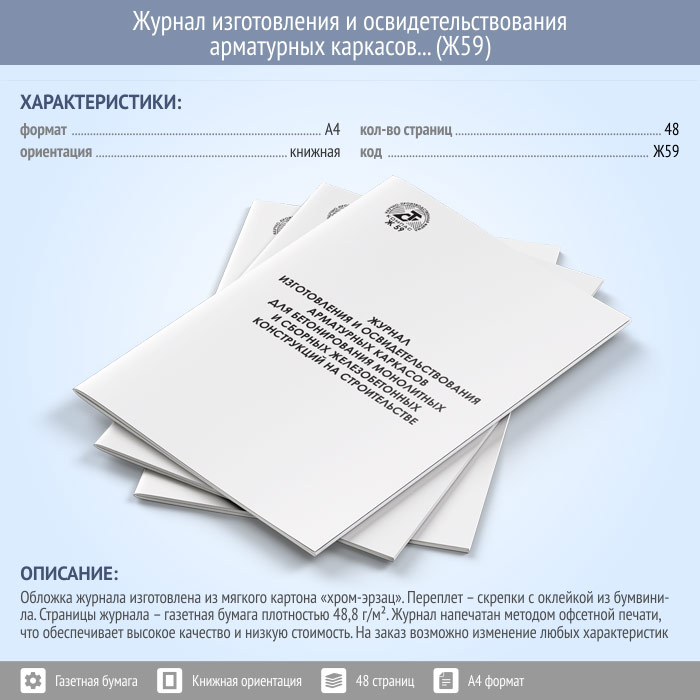 Журнал изготовления и освидетельствования арматурных каркасов для бетонирования монолитных и сборных железобетонных конструкций на строительстве (Ф-48) (48 стр., Ж59) в Обнинске купить
