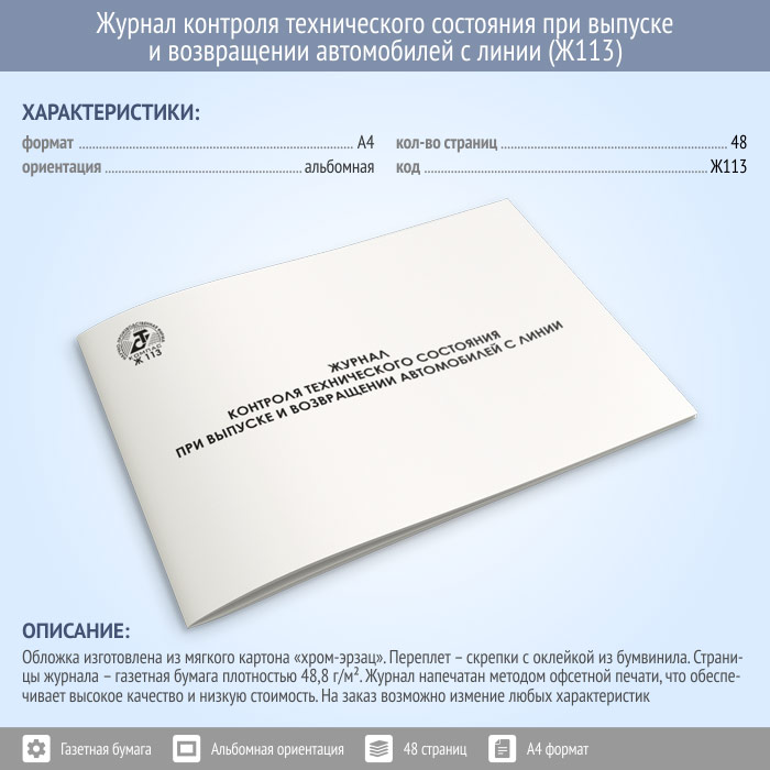 Журнал контроля технического состояния при выпуске и возвращении автомобилей с линии (48 стр., Ж113) в Обнинске купить